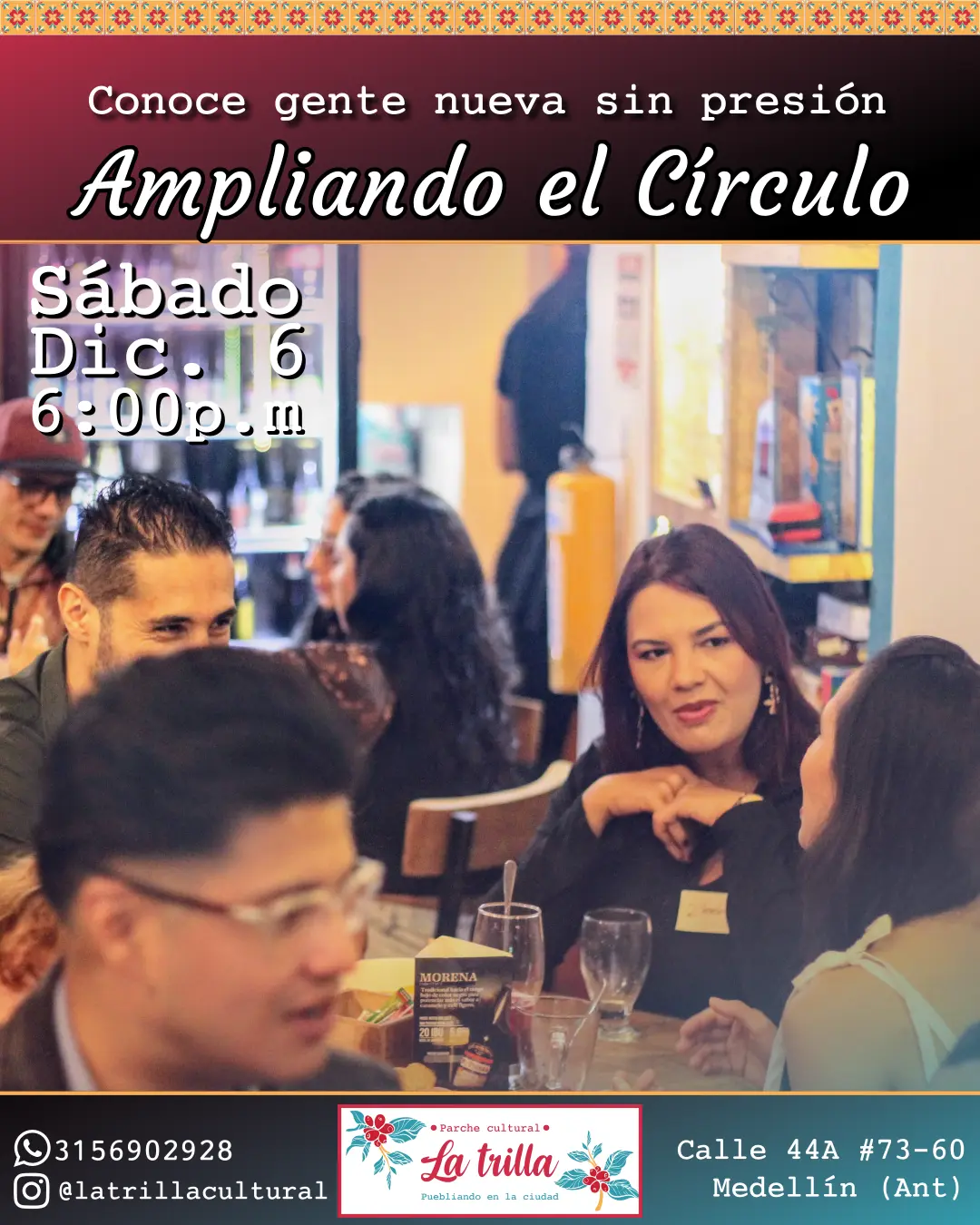 ‘Ampliando el Círculo’, la dinámica para conocer gente nueva en grupos pequeños. Un espacio seguro y perfecto para conectar de verdad. La entrada incluye bebida y pasabocas. Después, quédate para el show de Stand-Up Comedy y el mejor Karaoke.