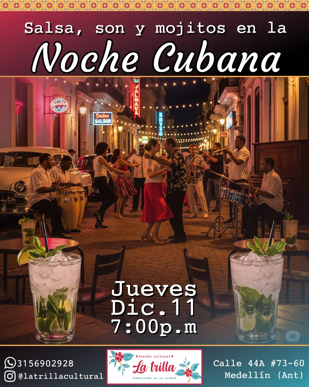Prepara tus mejores pasos: la Noche Cubana está de vuelta en La Trilla. Tendremos salsa, son y los mojitos más frescos, listos para un ambiente inigualable. La invitación incluye una clase básica de salsa gratis, perfecta para que te animes a bailar y vivir el sabor real de la isla.