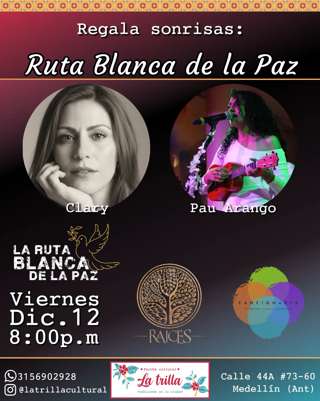 Te esperamos con tu donación para alcanzar la meta de 500 sonrisas en Camacol Niquía. Una noche de música increíble y solidaridad para construir la Ruta Blanca de la Paz. Un evento de Raices Colombia y Cancionarte